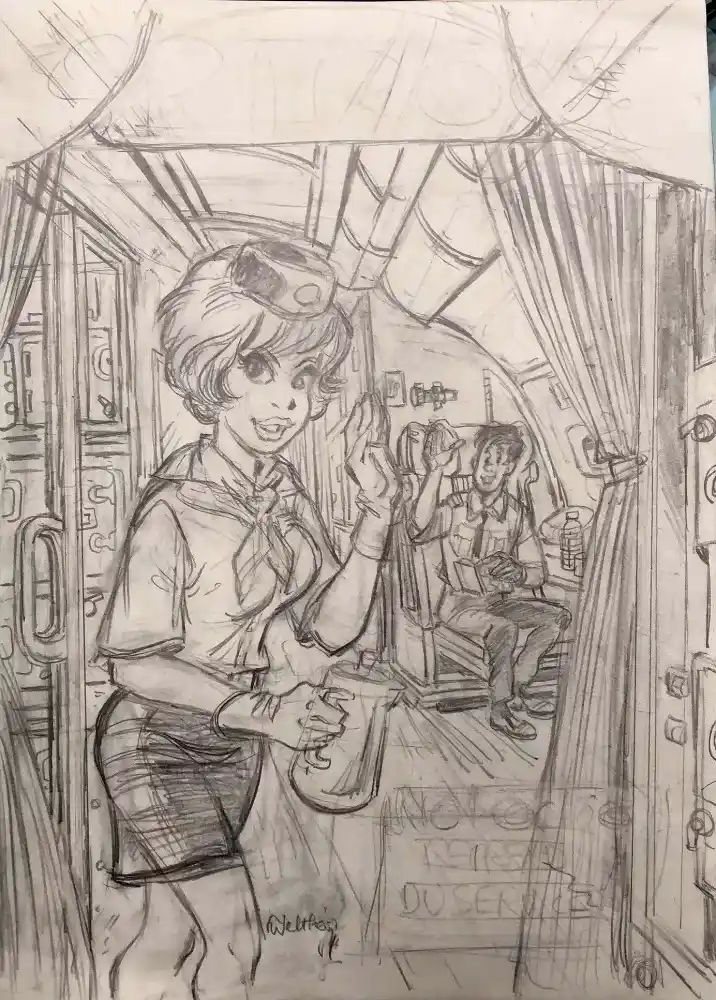 En attendant, voici le crayonné d’une recherche de couverture pour le journal Spirou pour la sortie de l’album, Natacha, Chanson d’avril. Rien n’est encore fixé mais on est certain que ça vous intéresse.