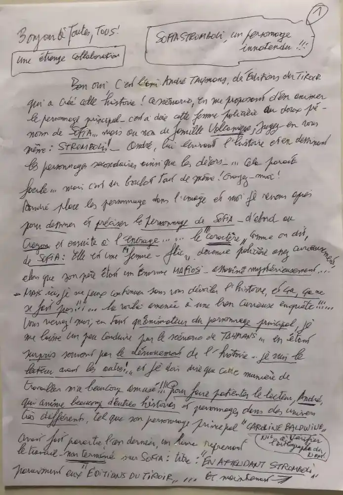 Pour faire patienter le lecteur André, qui anime beaucoup d’autres histoires et personnages dans des univers très différent, tels que son personnage principal “Caroline Baldwin”, avait fait paraître l’an dernier un livre reprenant le travail non terminé sur Sofia, dont le titre était “En attendant Stromboli”, également aux Éditions du Tiroir.